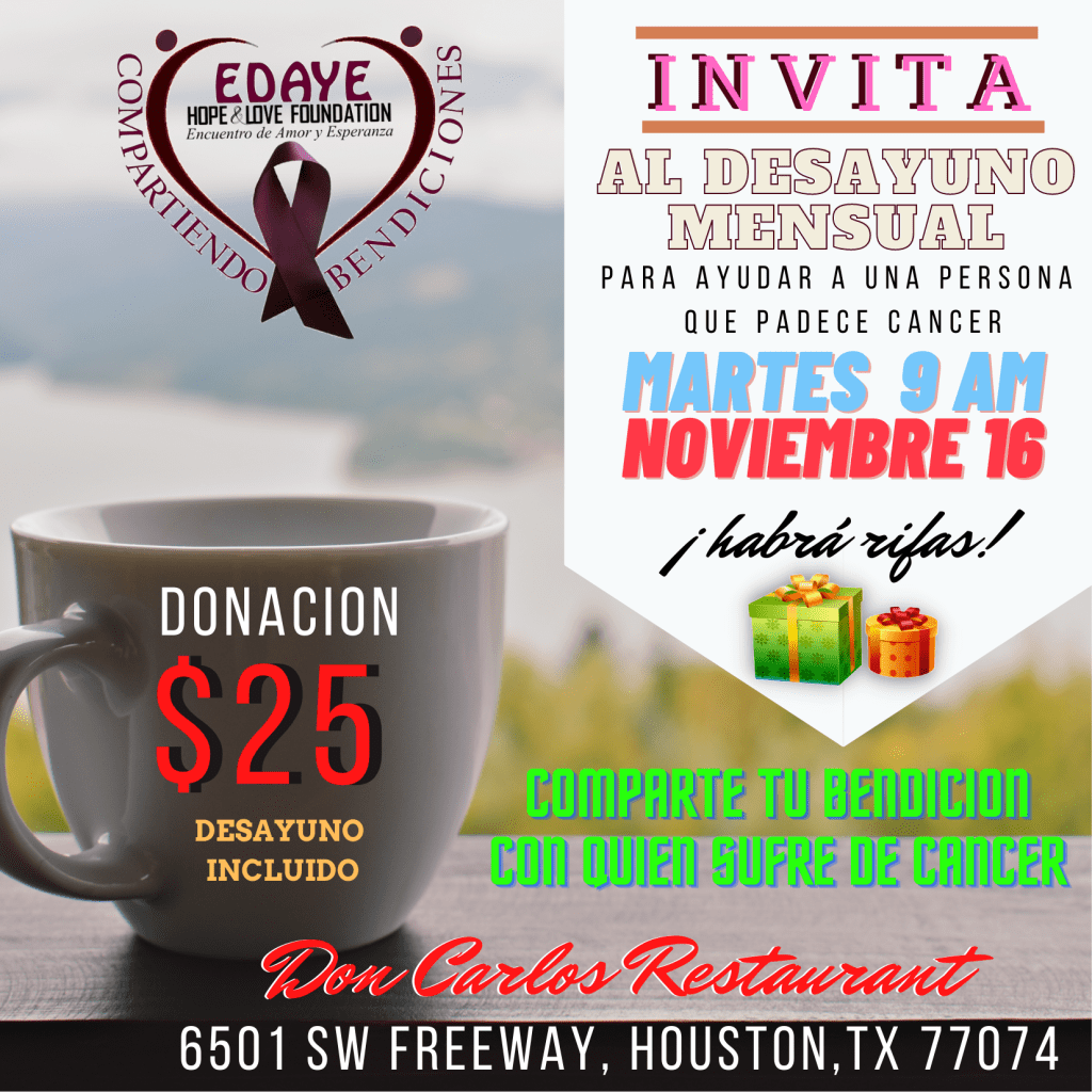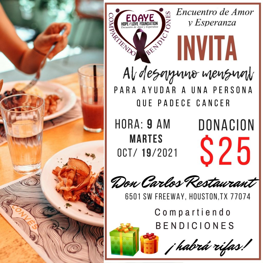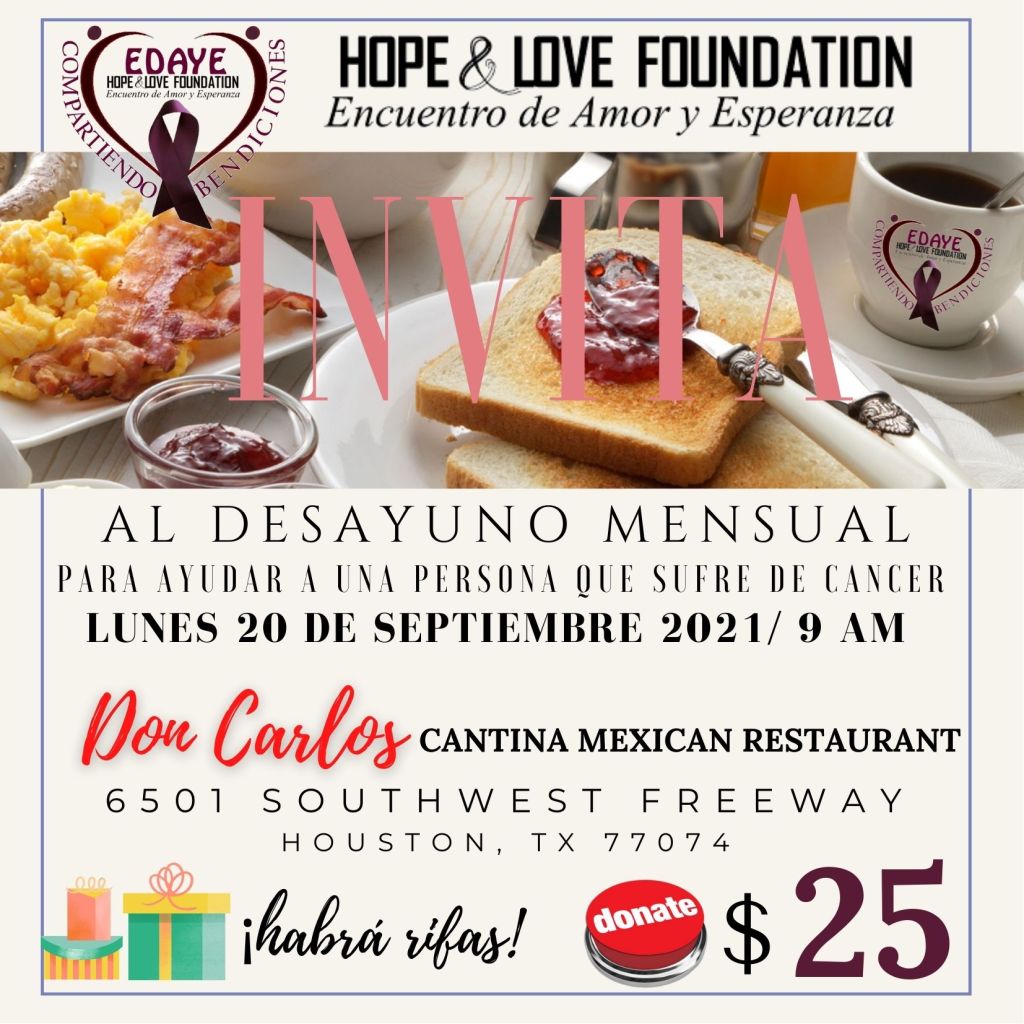 Comparte una mañana de amor asistiendo al desayuno ofrecido a una persona que sufre de cáncer. La donación incluye el desayuno.