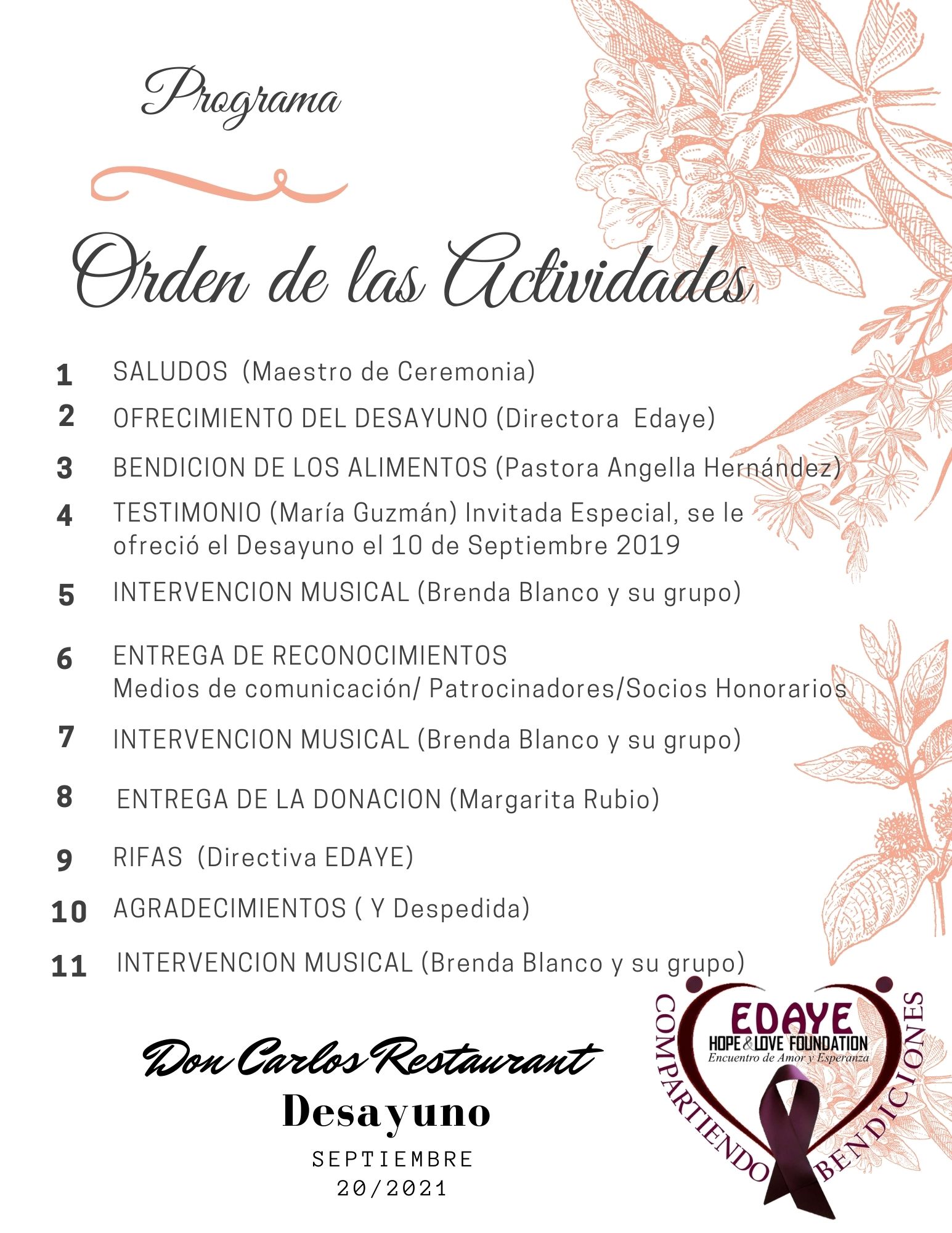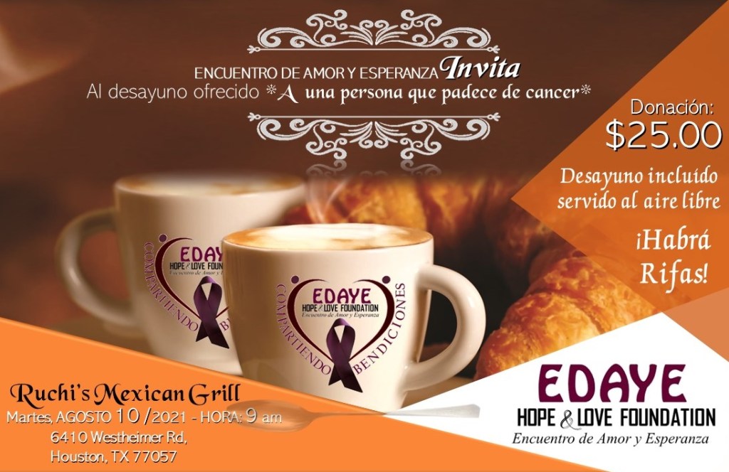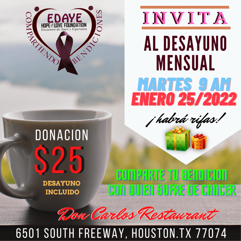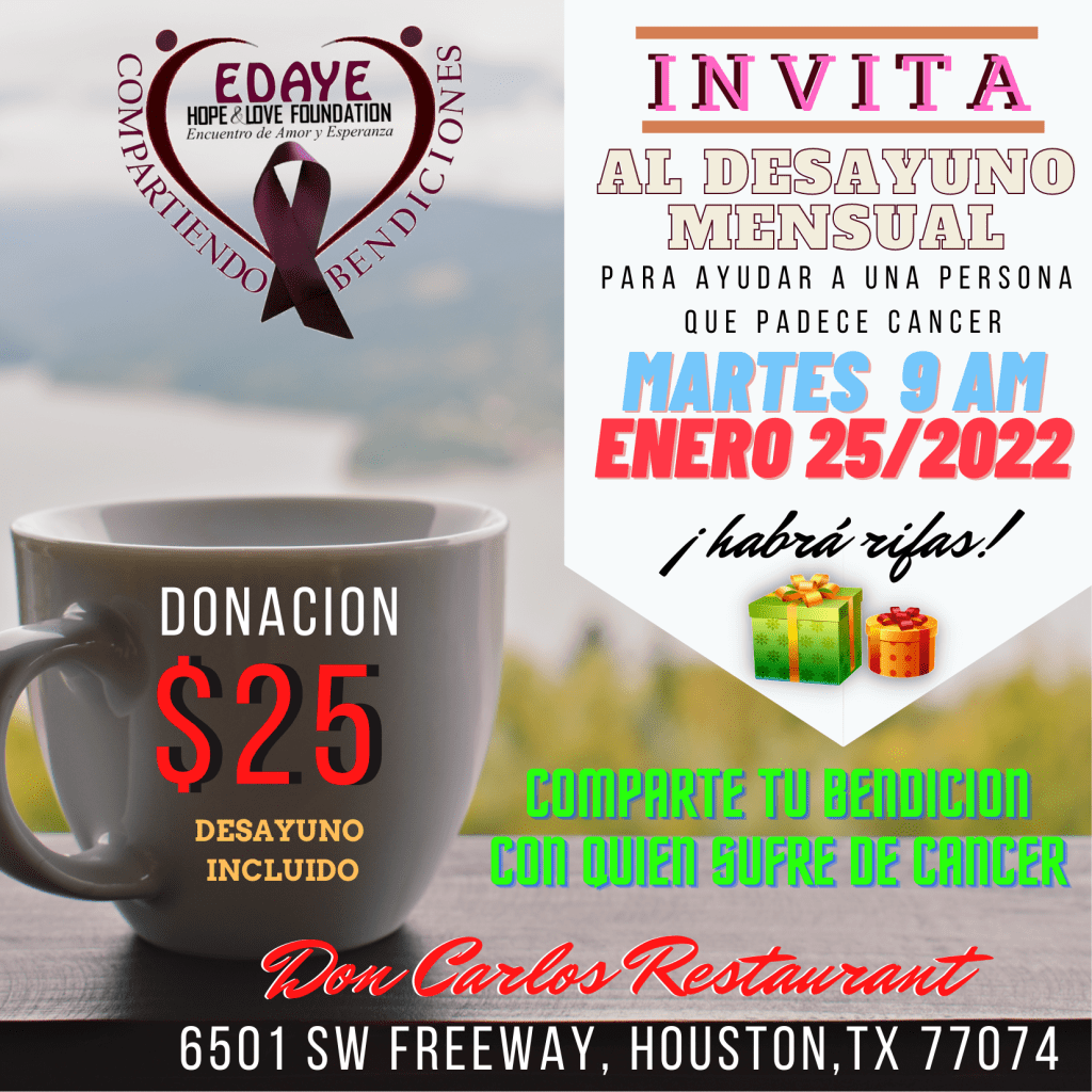 Comparte una mañana de amor asistiendo al desayuno ofrecido a una persona que sufre de cáncer. La donación incluye el desayuno.